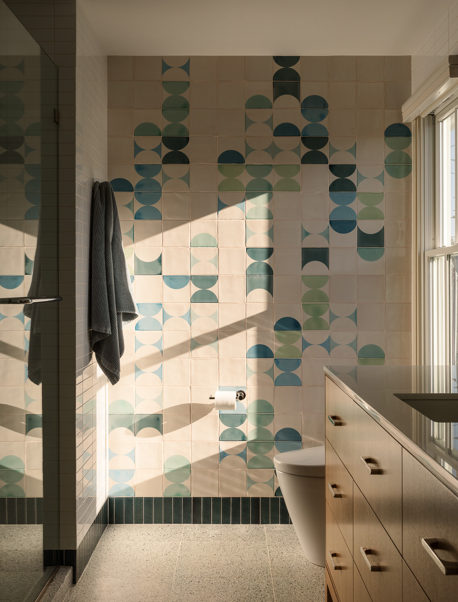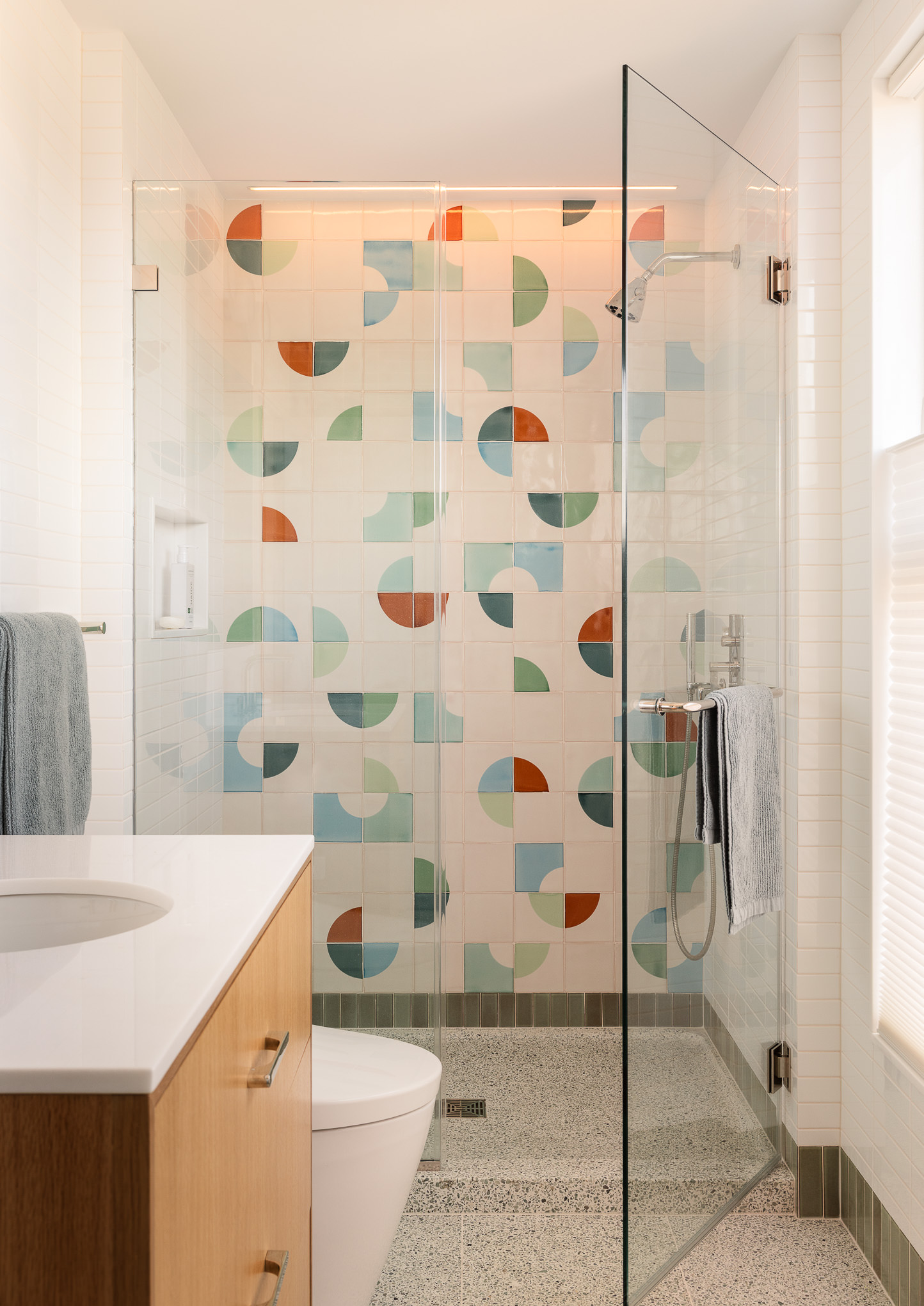Interior design of a bathroom with colorful tiles in a Cape May, NJ home