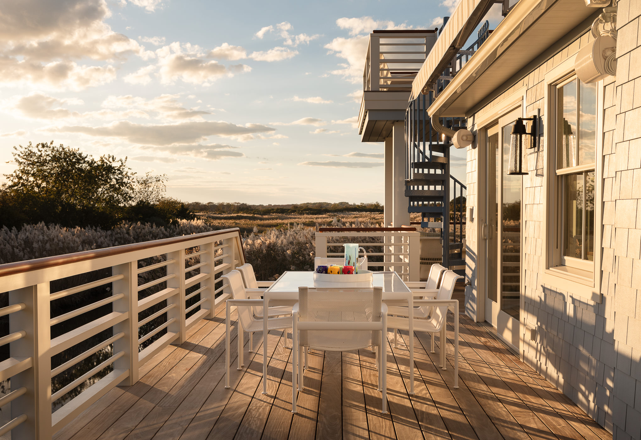 outdoor dining space with a sunset view in a custom home in Cape May, NJ